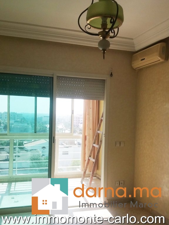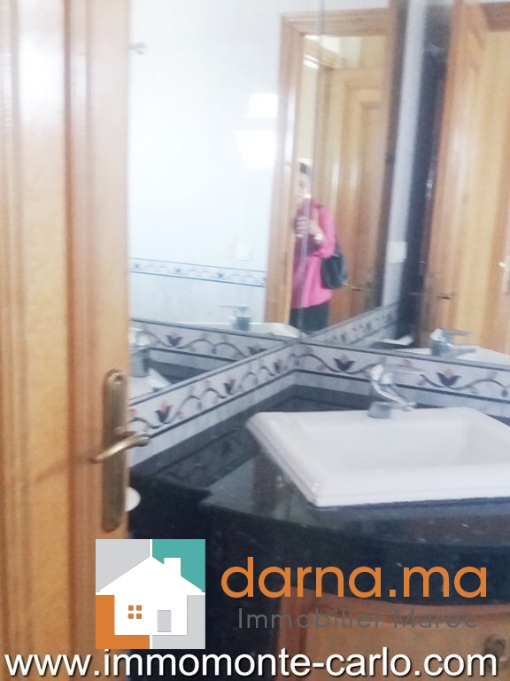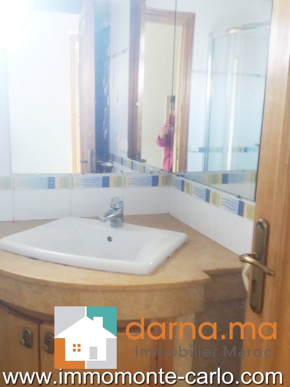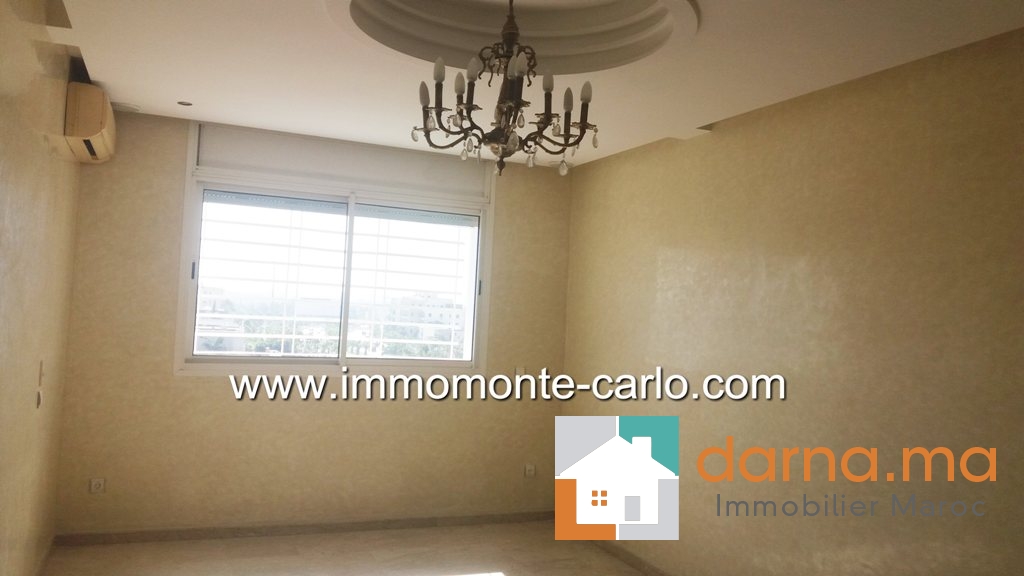 A louer un appartement Hay Riad à Rabat Maroc, avec beaucoup de goût  bien ensoleillé et proche de toutes les commodités, il se compose d'un double salon et salle à manger donnant sur une terrasse, une grande cuisine, 4 chambres dont une chambre parentale avec dressing et une salle de bain, 2 salles de bain, L'appartement dispose aussi de: