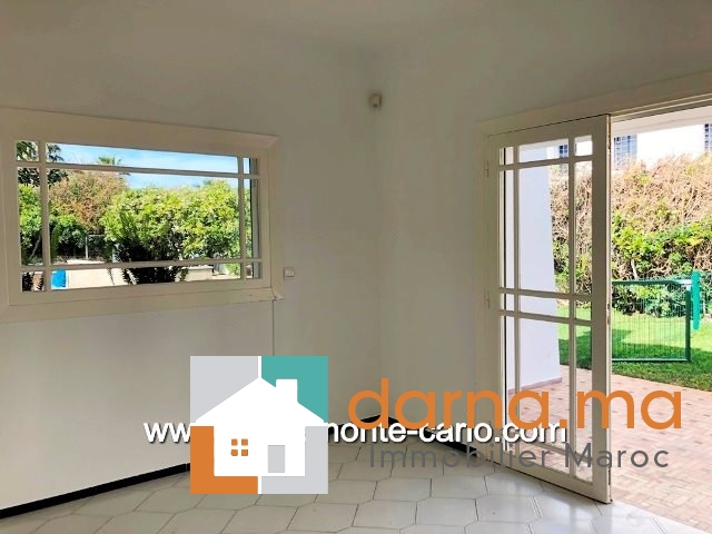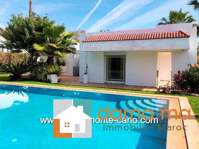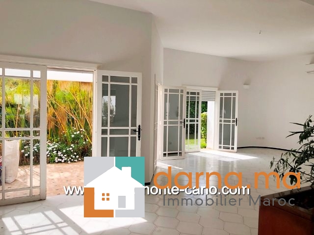 Location à Rabat une jolie villa de plain pied qui est répartie sur un seul étage. Située dans une rue calme à Souissi, proche de toutes les commodités.Cette villa  dispose du chauffage central et de la piscine et nombreuses ouvertures sur une belle grande terrasse donnant  le jardin et la piscine  exposée plein sud,  une grande réception avec cheminée qui donne sur le jardin, une salle d’eau des invités , une salle à manger à coté d’une cuisine , 4chambres : chambre parental avec dressing et salle de bain , chambre d’amis avec placards et sa propre salle de bain , 2 chambres enfants avec des placards et une salle de bain, un bureau, une demi sol composé de la chambre de service, salle de bain, pièce de rangement. De plus, à l’extérieur, il y a un garage automatique, espace de rangement et un logement du personnel, un beau jardin avec puit avec une pompe immergée neuve,