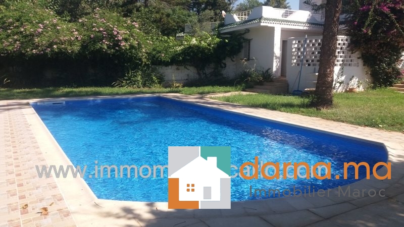 Location villa avec piscine à Rabat Maroc , villa ensoleillée et éclairée, très bien située et sécurisée, avec jardin bien entretenu et jolie piscine, composée de double salons, cheminée et terrasse donnant sur la piscine et le jardin, 4chambres, 3salles de bain, cuisine, buanderie, débarras, logement du personnel et garage…