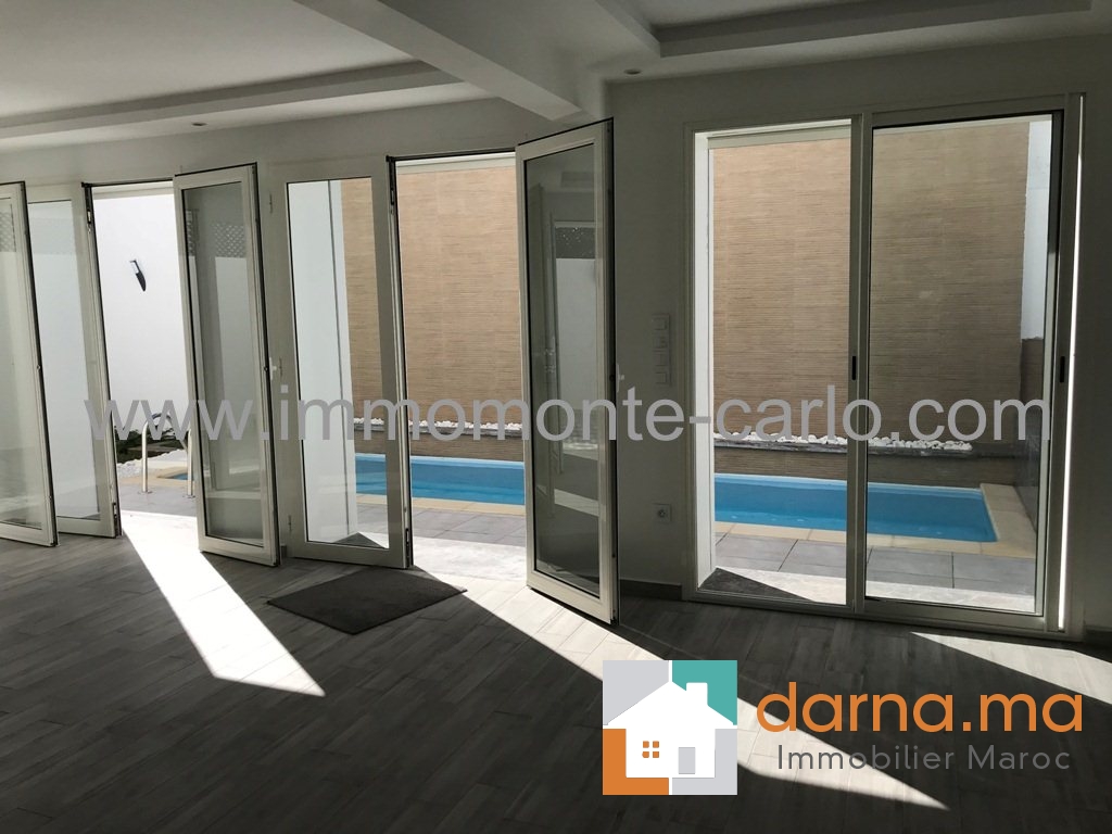 Location Rabat villa de très haute standing neuve moderne avec piscine, très bien située et bien sécurisée, avec chauffage central , climatisation, composée de double salons cheminée donnant sur la piscine et belle cascade, salle d’eau des invités, 4 chambres à coucher avec 3 salles de bain dont une suite parentale avec vue panoramique sur le Bouregreg et l'océan avec terrasse dressing et salle de bain, cuisine moderne bien équipé, buanderie, un grand garage, logement de personnel …Pour plus d’informations ou visite n’hésitez pas de contacter notre agence immobilière Immo Monte-Carlo au N° de tél: +212 (0)6 61 46 40 37 /+212 (0)6 61 21 25 47 ou Tél/Fax:+212 (0) 537 755 043 ou par E-mail : Cette adresse e-mail est protégée contre les robots spammeurs. Vous devez activer le JavaScript pour la visualiser. ou rendez-vous au 15.Av, Al Abtal N°4, Agdal RABAT MAROC.
