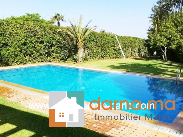 À louer à Rabat villa rénovée d’architecture moderne haut standing avec piscine chauffage, climatisation, cuisine neuve  moderne et équipée, villa très propre. Villa entourée d'un beau jardin avec  puit,  jolie piscine, grand garage, logement de gardien, construite sur 2 niveaux et composée de: Rez de chaussée spacieux et lumineux  avec terrasse donnant sur la piscine et le jardin, comprenant  deux salons, coin cheminée moderne, séjour avec cheminée, salle d’eau des invités, chambre d’amis avec salle de bain et une terrasse donnant sur la piscine et le jardin,  suite parental avec dressing, salle de bain et grande terrasse, bureau, 2 chambres à coucher  chacune avec sa salle de bain et dressing et terrasse privée cuisine, débarras, buanderie, logement de personnel….